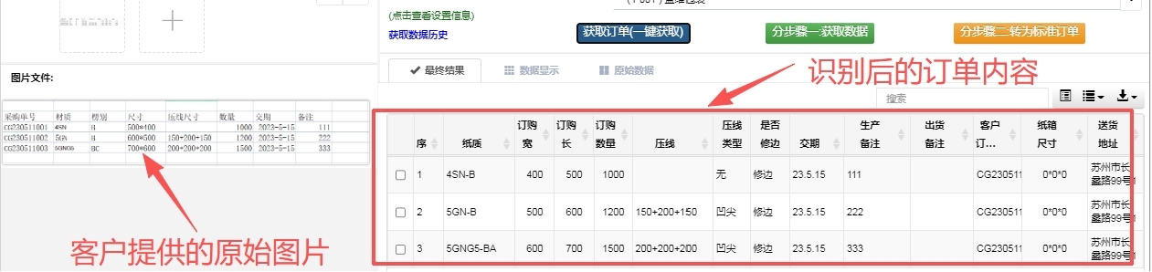 功能描述:支持微信移动端下单、Excel导入、OCR图片识别,帮助纸板厂提升纸板录单效率、减少因人为因素造成的错误。