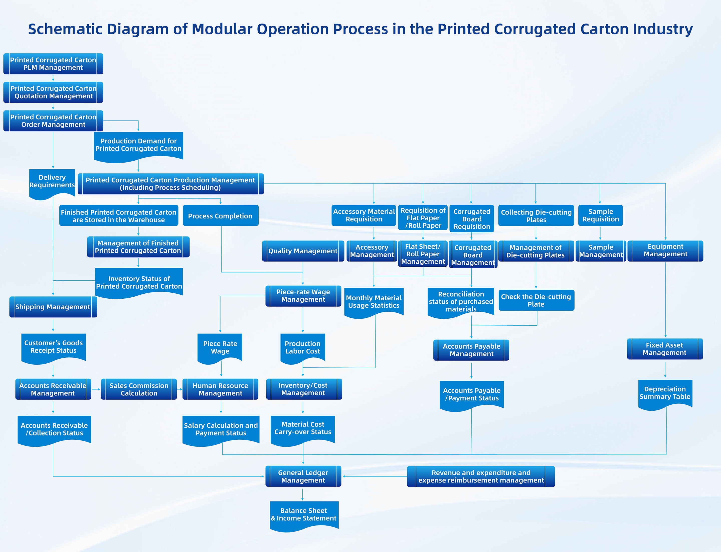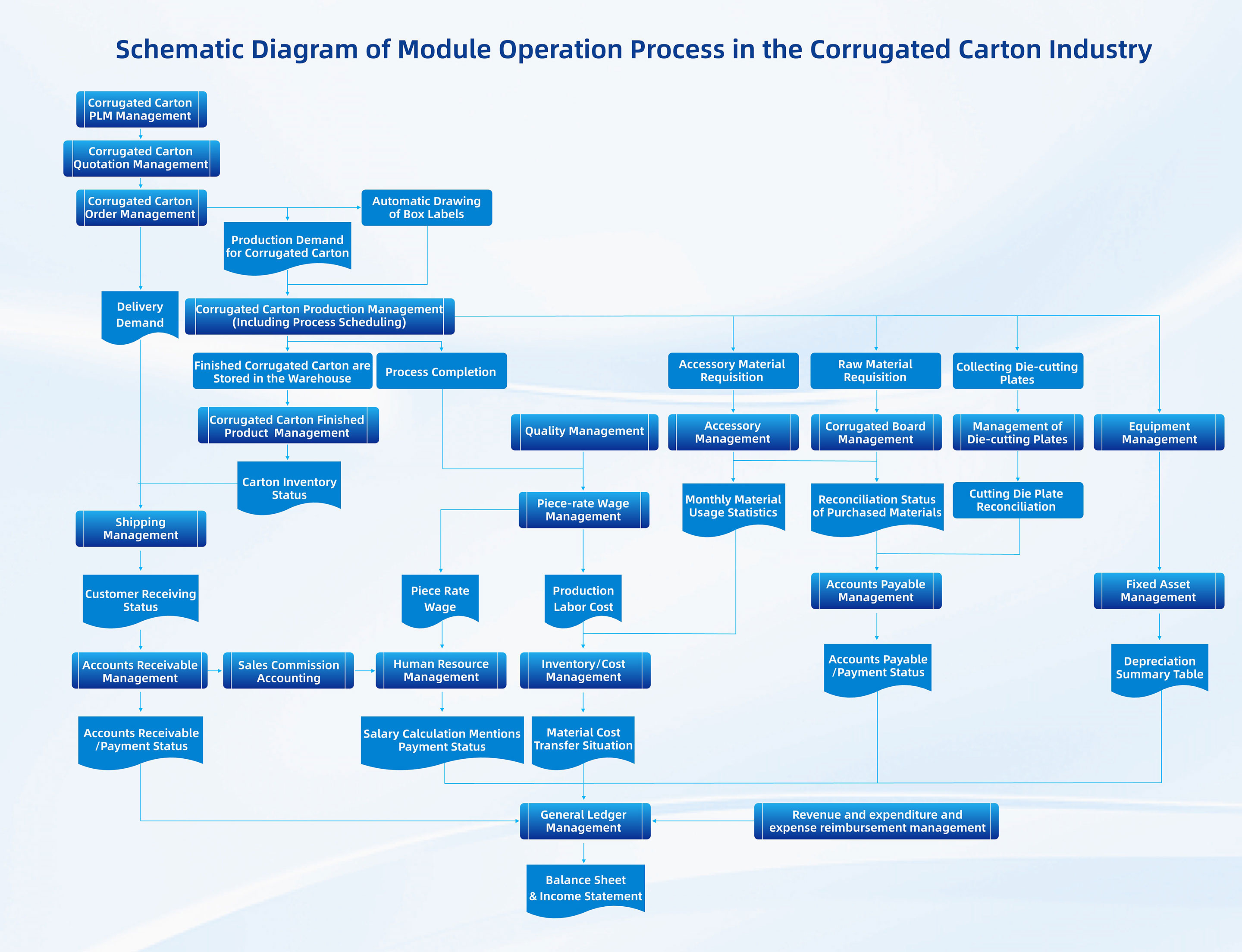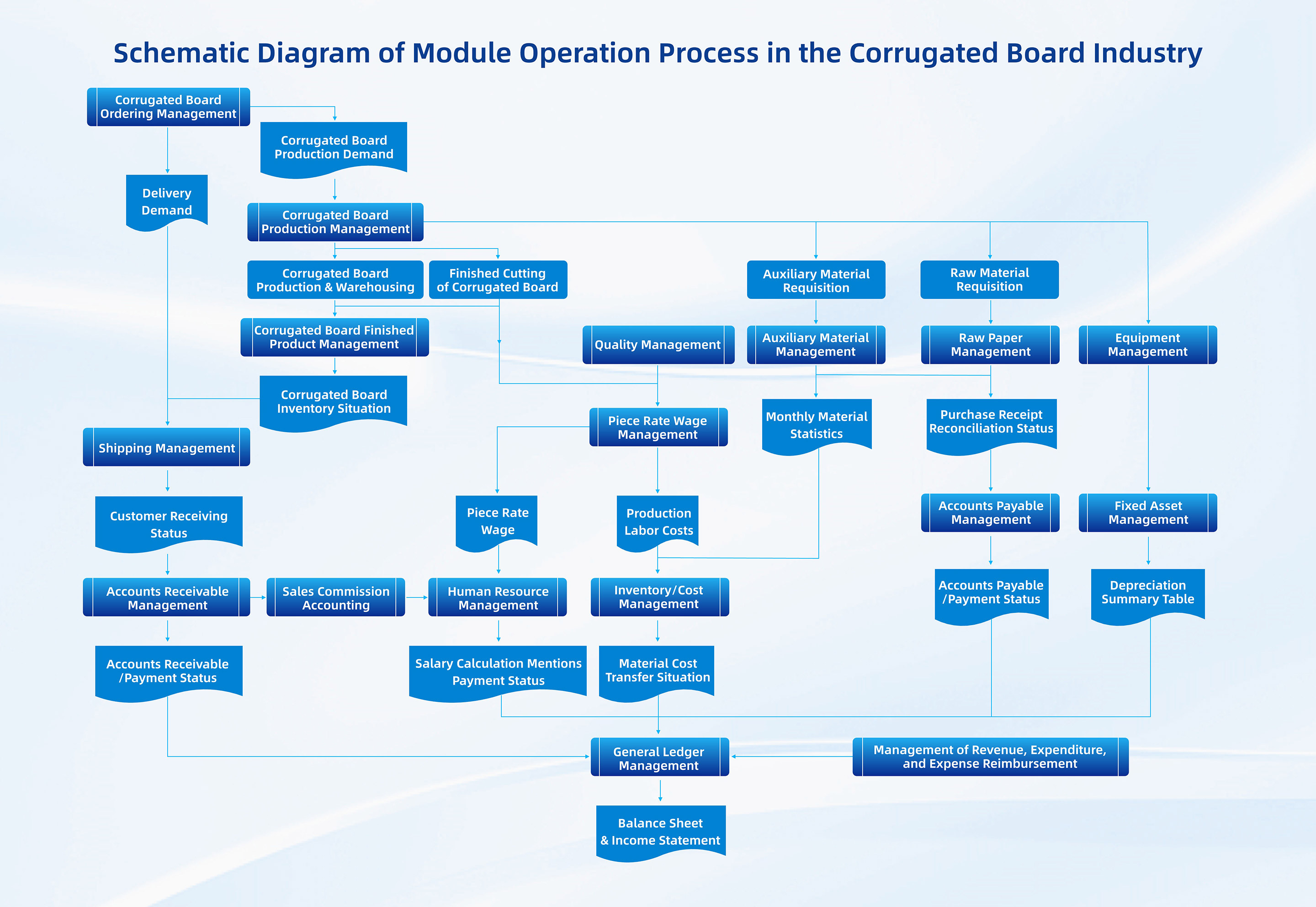 Eway is a software company that provides one-stop (ALL-IN-ONE) informatization systems for the packaging industry. We have been focusing on delivering customized solutions for corrugated board & corrugated carton manufacturers, covering all business processes including customer order management (including mobile WeChat ordering), production scheduling (including dual-knife scheduling), on-site machine production completion reporting (PDA-based reporting or direct equipment connection), finished product warehousing (including PDA code-scanning warehousing), transportation dispatching, production cost accounting, human resource management, quality management, and more.