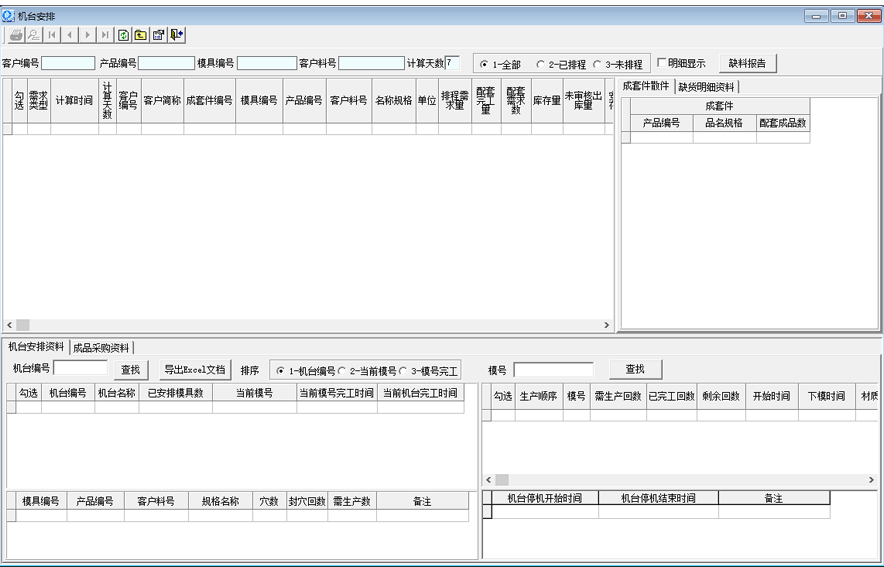 根据“交货排程”、“工艺路线”、“共模情况”及当前各机台的生产任务,系统计算出各机台的需生产产品和生产量,并预估其开始和结束时间。