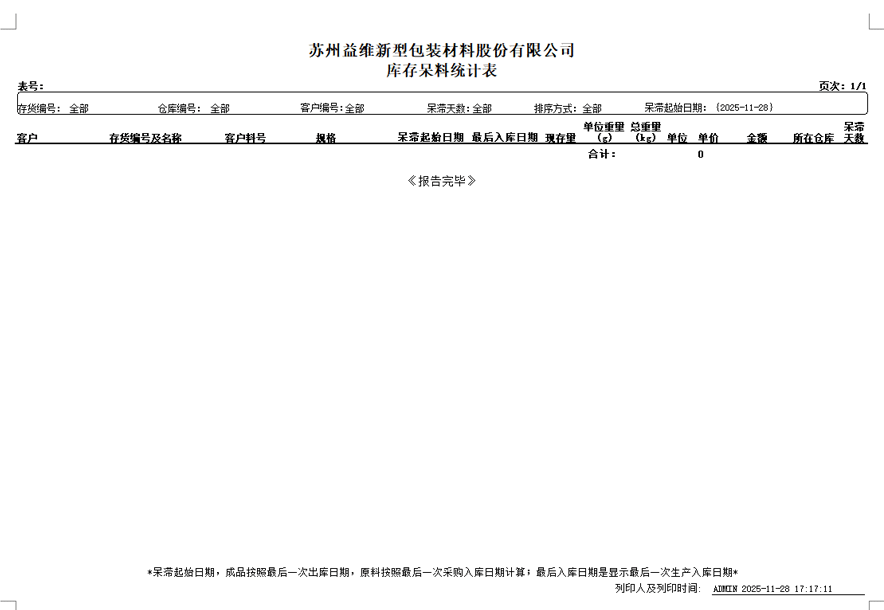 用于统计物料的库存呆滞情况,评估物料所占用的资金成本。