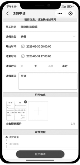 支持职员通过微信端发起请假申请,自动流转至对应审批节点,实现请假申请提报、审批流程处理、审批结果反馈的全流程线上化管理,提升考勤事务处理效率。