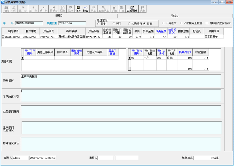 检验并登记纸箱生产过程中发现的问题,明确责任归属,助力后续针对性改善,持续提升生产品质。