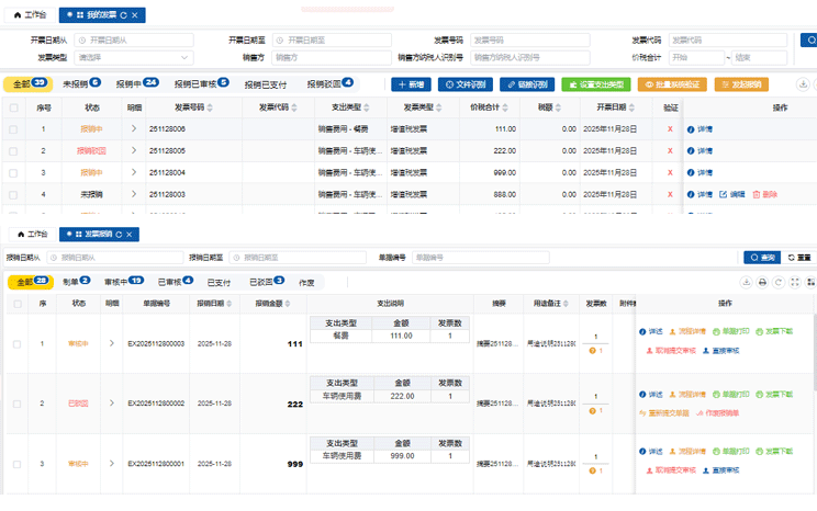 支持员工线上快速提交报销,系统自动完成发票重复性检查与真伪校验,有效规避重复报销和假票入账风险。