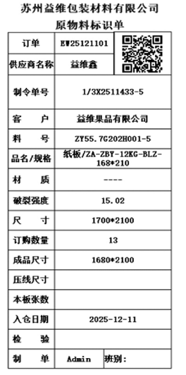 显示纸板信息,在纸板入库环节,能够通过该标签完成与对应纸箱生产制令单的关联绑定,实现纸板物料与纸箱生产需求的精准对应管理。