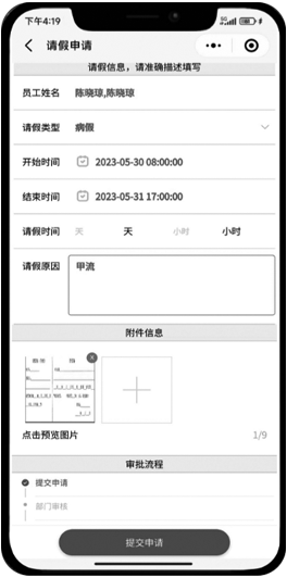 支持职员通过微信端发起请假申请,自动流转至对应审批节点,实现请假申请提报、审批流程处理、审批结果反馈的全流程线上化管理,提升考勤事务处理效率。