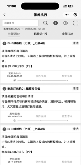 系统根据预设的保养周期,在到期前自动生成保养任务并推送提醒,员工可通过小程序便捷查看保养任务、录入设备保养情况。