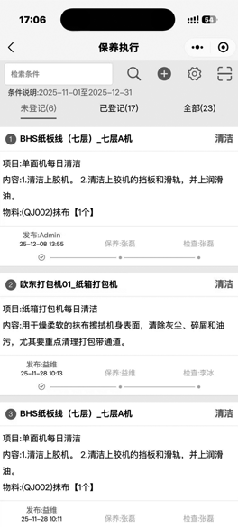 系统根据预设的保养周期,在到期前自动生成保养任务并推送提醒,员工可通过小程序便捷查看保养任务、录入设备保养情况。