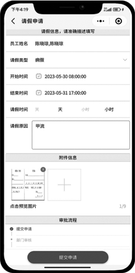 支持职员通过微信端发起请假申请,自动流转至对应审批节点,实现请假申请提报、审批流程处理、审批结果反馈的全流程线上化管理,提升考勤事务处理效率。
