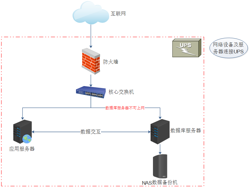 - UPS(后备电源):用于在市电停电时,UPS可以及时给服务器供电,防止服务器因停电造成硬件异常;UPS配置时选择带有网络通讯线的型号,以实现无人值守时让服务器正常关机;